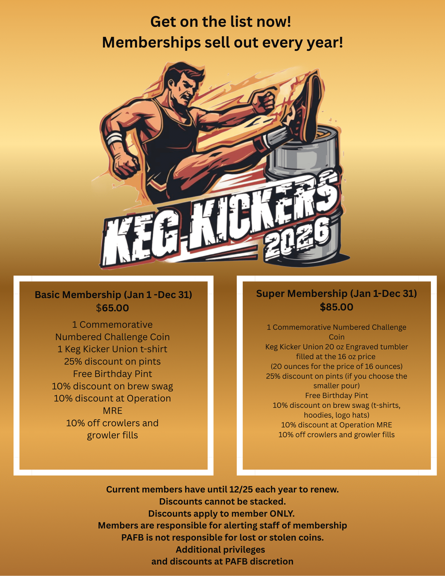 Your challenge coin and t-shirt will be available as soon as we receive them from the distributor. Each year they are different and will arrive based on the artist designing the coin and shipping. Your membership benefits will begin January 1 and end December 31.